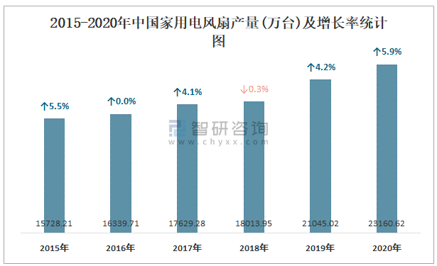 2015-2020年中國家用電風扇產量及增長率統計圖
