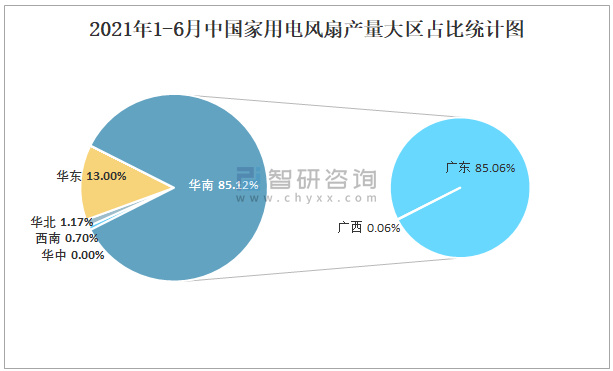 2021年1-6月中國家用電風扇產量大區占比統計圖