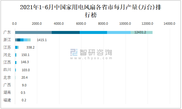 2021年1-6月中國家用電風扇各省市每月產量排行榜