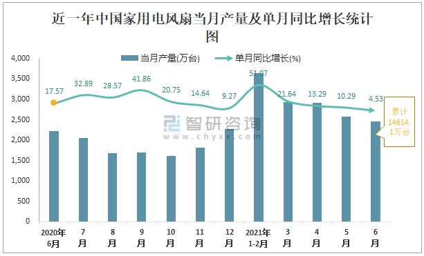根據國家統計局數據顯示:2021年6月中國家用電風扇產量為2465萬臺,同比增長4.53%;2021年1-6月中國家用電風扇累計產量為14614.1萬臺,同比增長16.98%;2015-2020年中國家用電風扇產量逐年遞增,2020年達到最高。