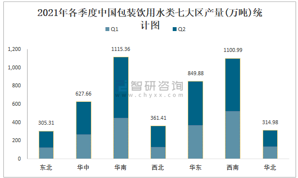 根據國家統計局數據顯示:2021年各季度中國包裝飲用水類主要集中在華南、西南、華東地區生產;2021年1-6月中國包裝飲用水類產量大區分布相對均衡,其中華南地區產量最高,特別是廣東省貢獻了最多產量;2021年1-6月中國包裝飲用水類各省產量呈現梯隊式分布,廣東、四川等省產量排名前二。