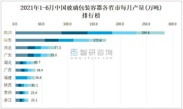 2021年1-6月中國(guó)玻璃包裝容器各省市每月產(chǎn)量排行榜
