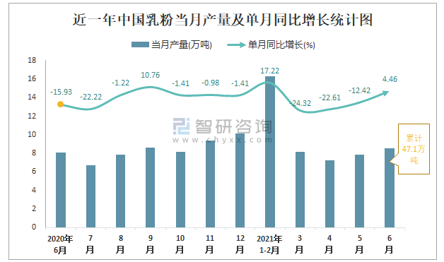 近一年中國(guó)乳粉當(dāng)月產(chǎn)量及單月同比增長(zhǎng)統(tǒng)計(jì)圖