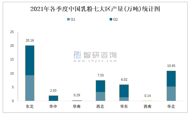 2021年各季度中國(guó)乳粉七大區(qū)產(chǎn)量統(tǒng)計(jì)圖