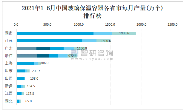 2021年1-6月中國玻璃保溫容器各省市每月產量排行榜