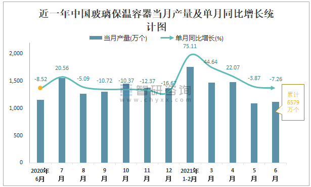 根據國家統計局數據顯示:2021年6月中國玻璃保溫容器產量為1120萬個,同比下降7.26%;2021年1-6月中國玻璃保溫容器累計產量為6579萬個,同比增長17.88%;2015-2020年中國玻璃保溫容器產量2016年達到最高,此后逐年遞減。