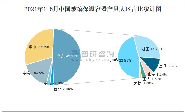 2021年1-6月中國玻璃保溫容器產量大區占比統計圖