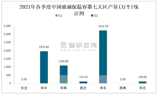 2021年各季度中國玻璃保溫容器七大區產量統計圖