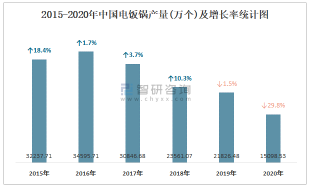 2015-2020年中國電飯鍋產量及增長率統計圖