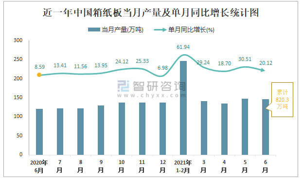 根據(jù)國家統(tǒng)計(jì)局?jǐn)?shù)據(jù)顯示:2021年6月中國箱紙板產(chǎn)量為146萬噸,同比增長20.12%;2021年1-6月中國箱紙板累計(jì)產(chǎn)量為820.3萬噸,同比增長36.52%;2015-2020年中國箱紙板產(chǎn)量總體呈現(xiàn)上升趨勢,2020年達(dá)到最大。
