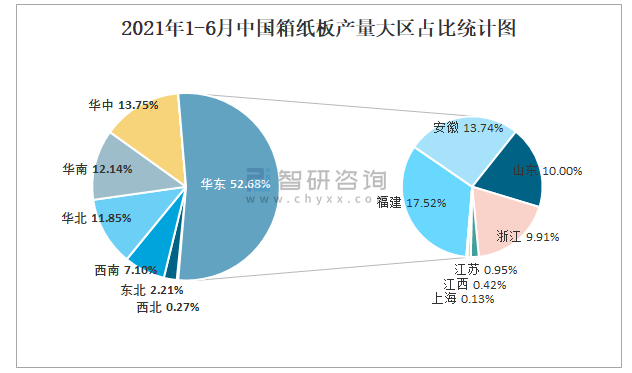 2021年1-6月中國箱紙板產(chǎn)量大區(qū)占比統(tǒng)計(jì)圖