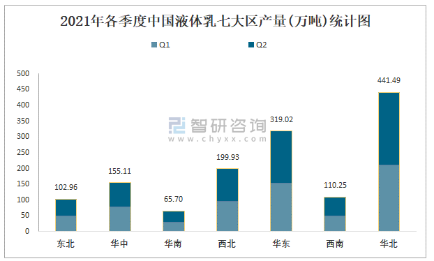 2021年各季度中國液體乳七大區產量統計圖