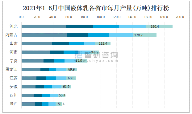 2021年1-6月中國液體乳各省市每月產量排行榜