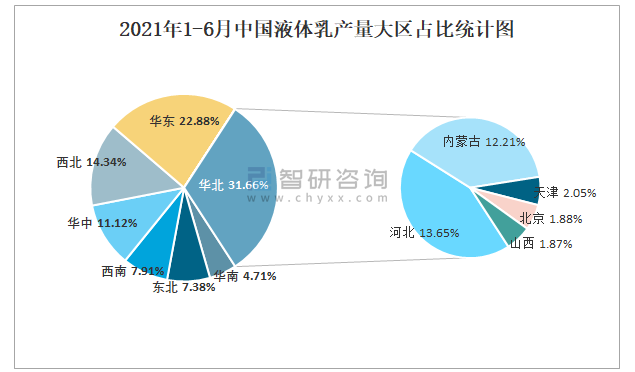 2021年1-6月中國液體乳產量大區占比統計圖