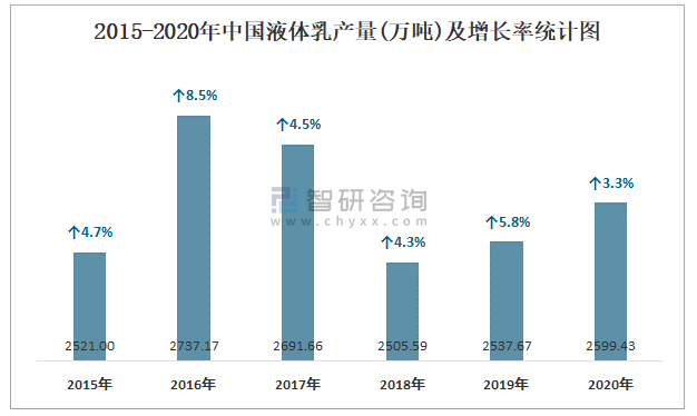 2015-2020年中國液體乳產量及增長率統計圖