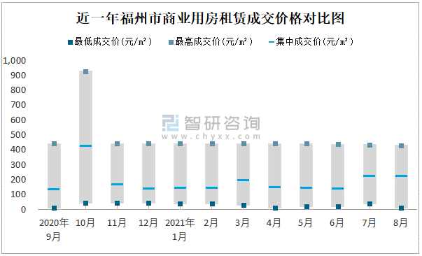 根據(jù)國信房地產(chǎn)信息網(wǎng)數(shù)據(jù)可知:近一年福州市商業(yè)用房租賃集中成交價在132元/m²-423元/m²之間波動,8月集中成交價為219元/m²;寫字樓租賃集中成交價今年5月達(dá)到最高值(71元/m²)。