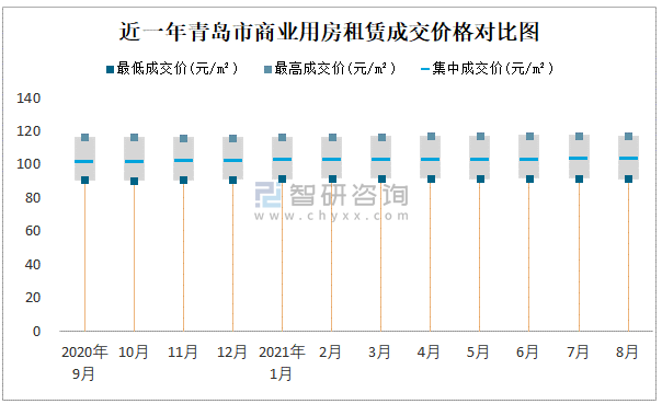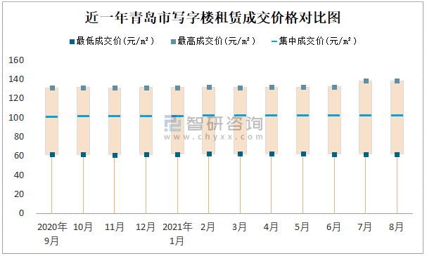 根據國信房地產信息網數據可知:近一年青島市商業用房租賃集中成交價在101元/m²-103元/m²之間波動,8月集中成交價為103元/m²;寫字樓租賃集中成交價今年8月達到最高值(101.7元/m²)。