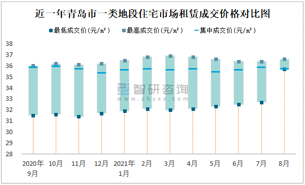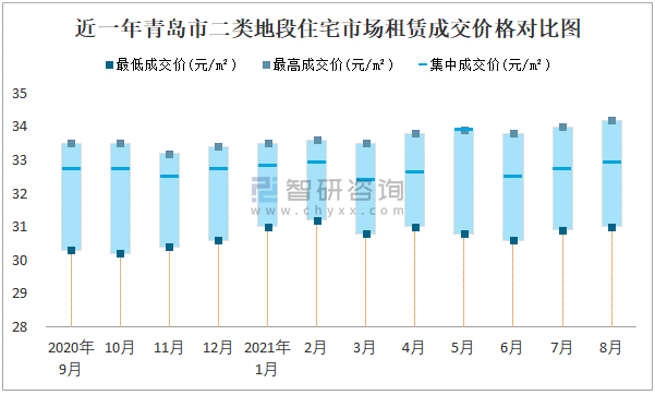 根據國信房地產信息網數據可知:近一年青島市一類地段住宅市場租賃成交價格有一定幅度波動,8月最高成交價與最低成交價差距為0.9元/m²;近一年青島市二類地段住宅市場租賃最低成交價與最高成交價的差距在2.4元/m²-3.3元/m²之間波動,2020年10月差距達到最大;近一年三類地段住宅市場租賃成交價在29.6元/m²-32.4元/m²之間波動。