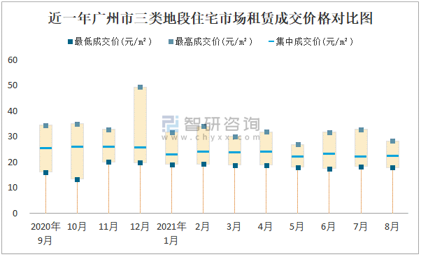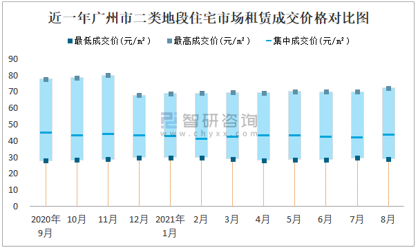 根據國信房地產信息網數據可知:2021年8月廣州市7類房屋中,廉租房無統計數據,公共租賃房租賃集中成交價為27.86元/m²;商業用房租賃最低成交價、最高成交價、集中成交價均高于其他類房屋價格;三類地段住宅市場租賃集中成交價約為21.83元/m²,商業用房租賃集中成交價高于寫字樓租賃集中成交價。