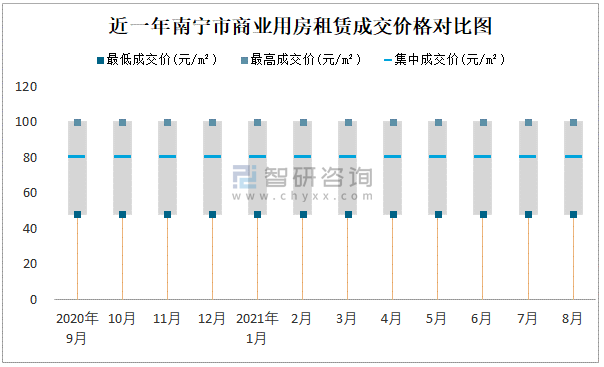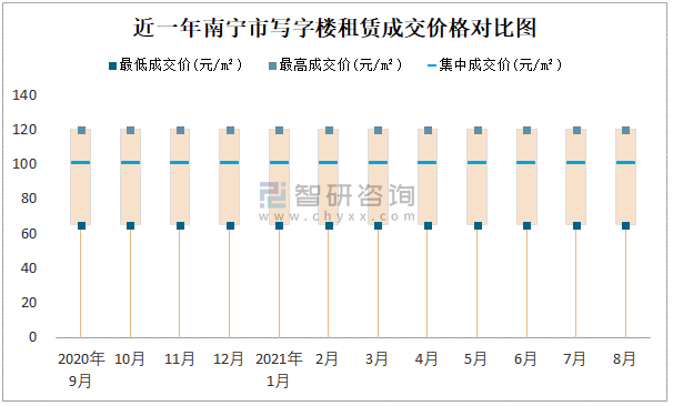 根據(jù)國信房地產(chǎn)信息網(wǎng)數(shù)據(jù)可知:近一年南寧市商業(yè)用房租賃集中成交價變化較小,基本穩(wěn)定在80元/m²;寫字樓租賃集中成交價穩(wěn)定在100元/m²。