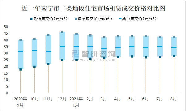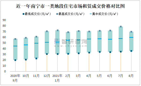 2021年8月南寧市房屋租賃市場價格走勢:一類地段住宅市場租賃價格在35.29元/㎡-78.29元/㎡之間,集中成交價約為58.93元/㎡
