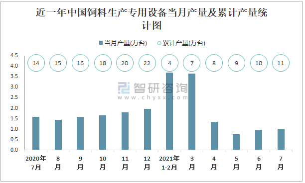 近一年中國飼料生產專用設備當月產量及累計產量統計圖