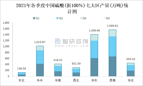 2021年各季度中國硫酸(折100%)七大區產量統計圖