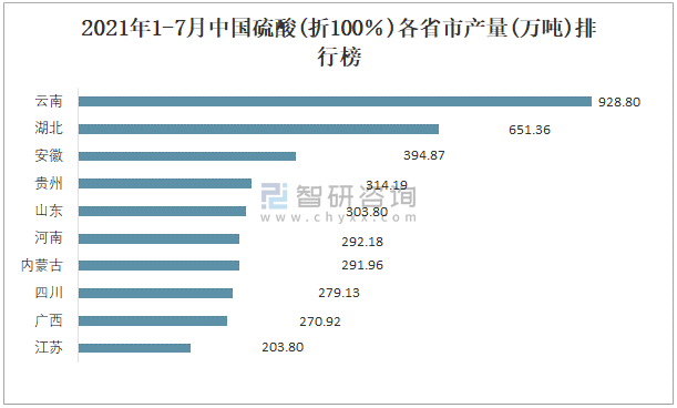 2021年1-7月中國硫酸(折100%)各省市產量排行榜