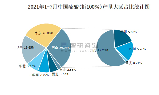 2021年1-7月中國硫酸(折100%)產量為5370.5萬噸 西南地區產量最高(占比29.1%)