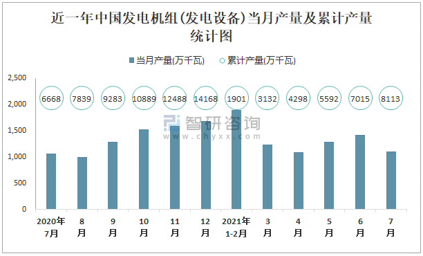 近一年中國發(fā)電機組(發(fā)電設備)當月產(chǎn)量及累計產(chǎn)量統(tǒng)計圖
