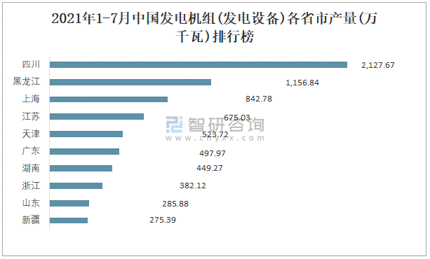 2021年1-7月中國發(fā)電機組(發(fā)電設備)各省市產(chǎn)量排行榜