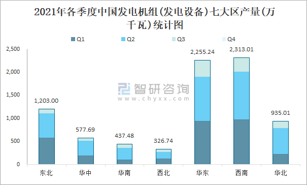 2021年各季度中國發(fā)電機組(發(fā)電設備)七大區(qū)產(chǎn)量統(tǒng)計圖