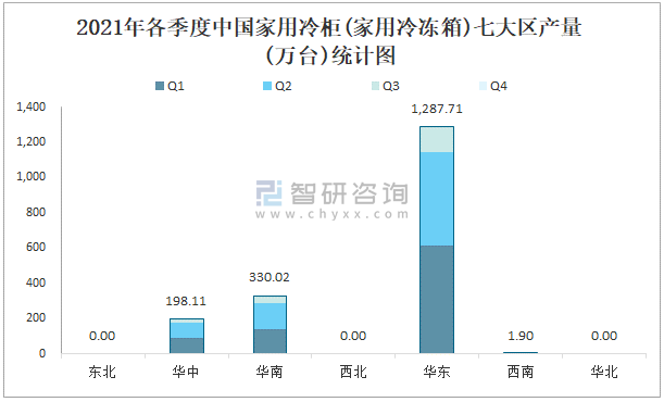 2021年各季度中國家用冷柜(家用冷凍箱)七大區產量統計圖