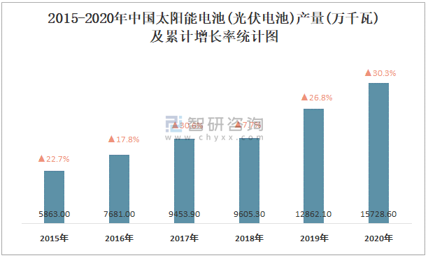 2015-2020年中國太陽能電池(光伏電池)產量及增長率統計圖