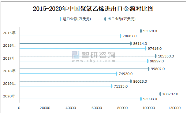 2015-2020年中國聚氯乙烯進出口金額對比統計圖
