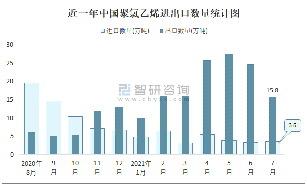根據中國海關數據顯示:2021年7月中國聚氯乙烯進口數量為3.6萬噸,出口數量為15.8萬噸;進口金額為6071萬美元,出口金額為21908萬美元;近一年中國聚氯乙烯出口總金額大于進口總金額,貿易順差為主,7月出口均價1386.6美元/噸。