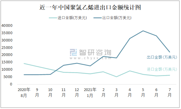 近一年中國聚氯乙烯進出口金額統計圖