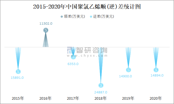2015-2020年中國聚氯乙烯順(逆)差統計圖