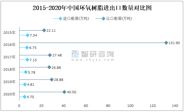 2015-2020年中國環氧樹脂進出口數量對比統計圖