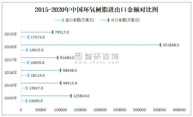 2015-2020年中國環氧樹脂進出口金額對比統計圖