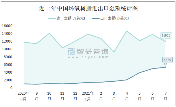 近一年中國環氧樹脂進出口金額統計圖