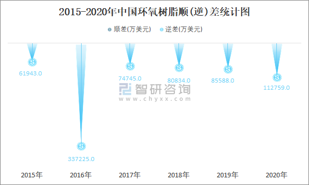 2015-2020年中國環氧樹脂順(逆)差統計圖