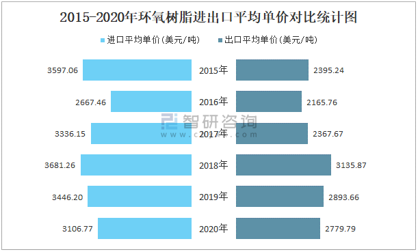 2015-2020年環氧樹脂進出口平均單價對比統計圖