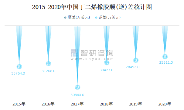 2015-2020年中國丁二烯橡膠順(逆)差統計圖