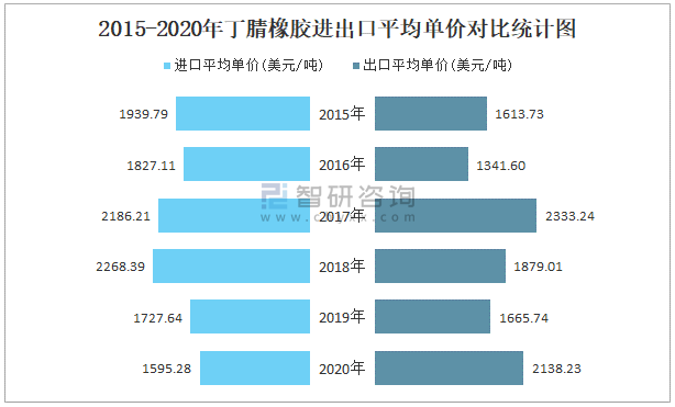 2015-2020年丁腈橡膠進出口平均單價對比統(tǒng)計圖