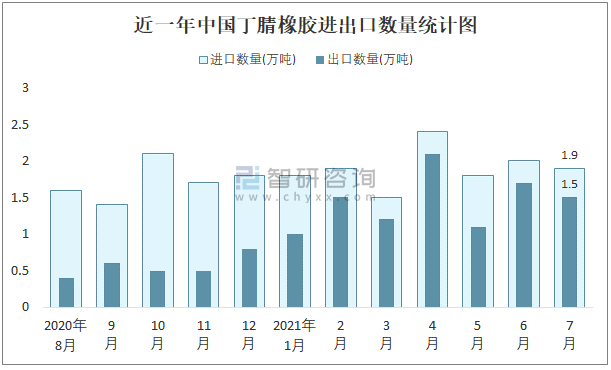 近一年中國丁腈橡膠進出口數(shù)量統(tǒng)計圖