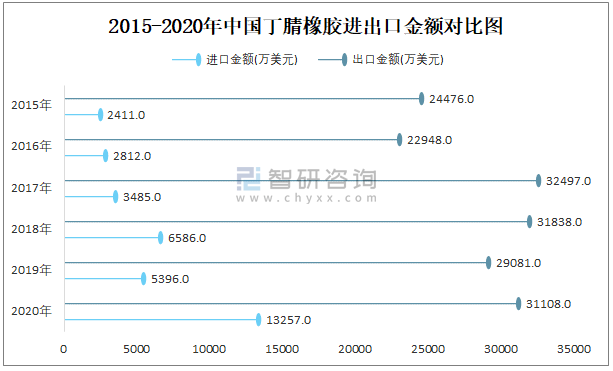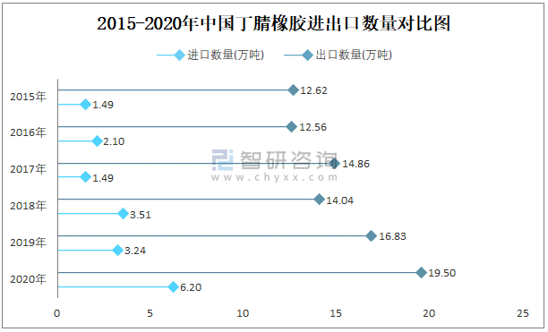 2015-2020年中國丁腈橡膠進出口數(shù)量對比統(tǒng)計圖
