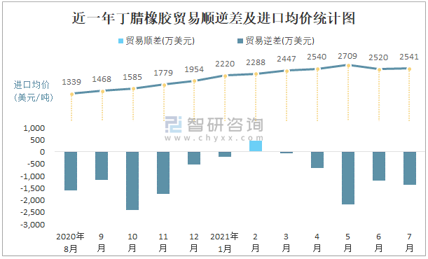 近一年丁腈橡膠貿(mào)易順逆差及進口均價統(tǒng)計圖