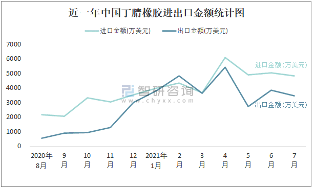 近一年中國丁腈橡膠進出口金額統(tǒng)計圖