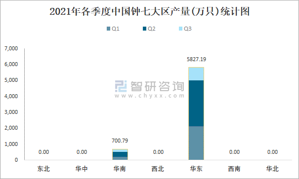 2021年各季度中國鐘七大區產量統計圖